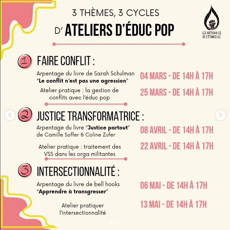 Les prochains ateliers d’éducation populaire organisés par les Artisan·es de l’Etincelle :